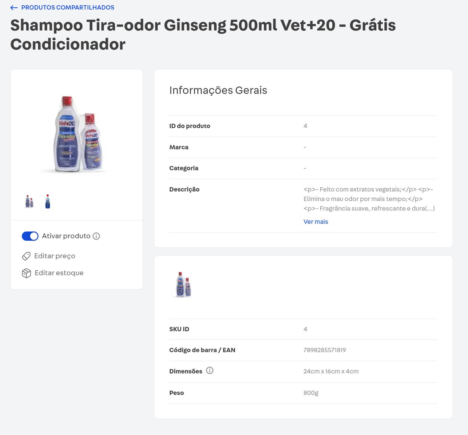 A página Detalhes do Produto na funcionalidade Produtos Compartilhados é onde todas as informações sobre um produto específico são visualizadas. É a partir dela que o seller: