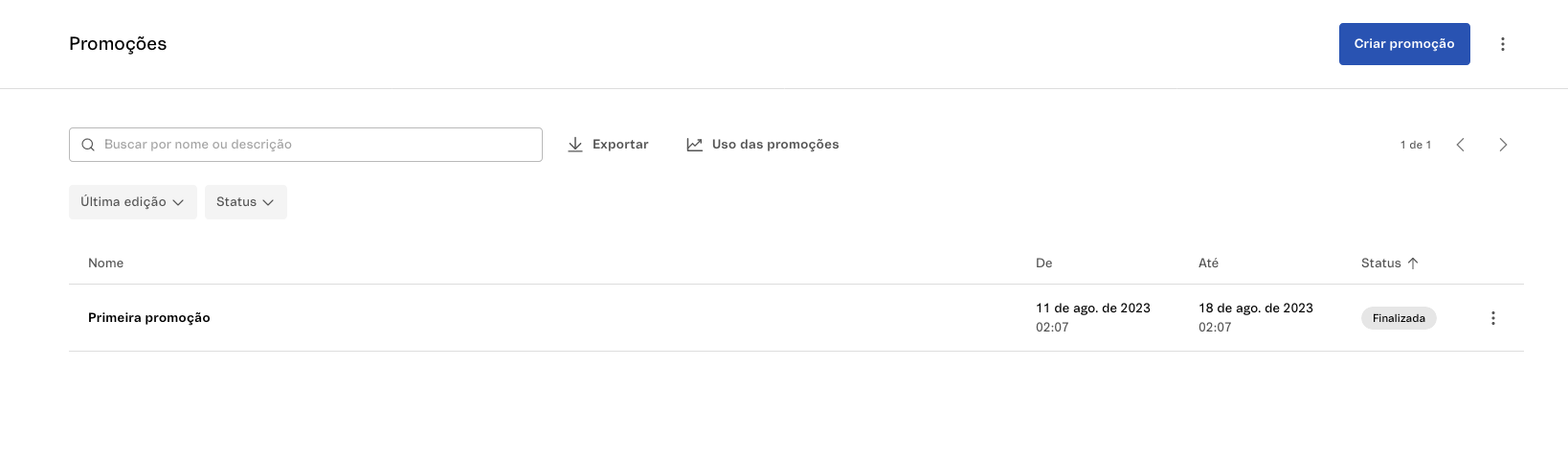 | Status | Status da promoção, que pode estar: - Ativa: quando a promoção está ativada e sendo aplicada na loja. - Programada: quando a promoção foi programada. - Pausada: quando a promoção estiver pausada. - Finalizada: quando a promoção foi encerrada. |