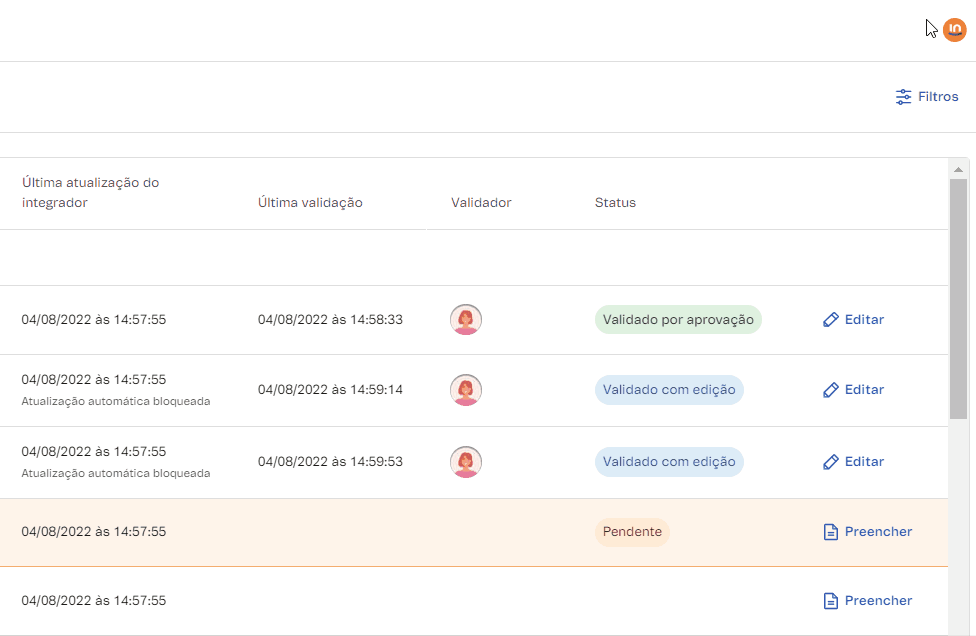 O ambiente de validação também apresenta novas colunas para consulta, como Última atualização do Integrador, Última validação e a foto do Validador.