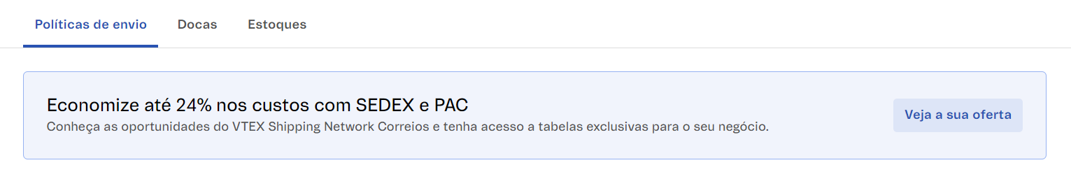 Caso você já possua um contrato com os Correios, antes de ativar o VTEX Shipping Network Correios você deve desativá-lo nas suas políticas de envio ou removê-lo das docas. Se isso não for feito, a plataforma VTEX pode gerar erros de duplicidade e outros problemas, inclusive erros na emissão de etiquetas no Pronto para envio.